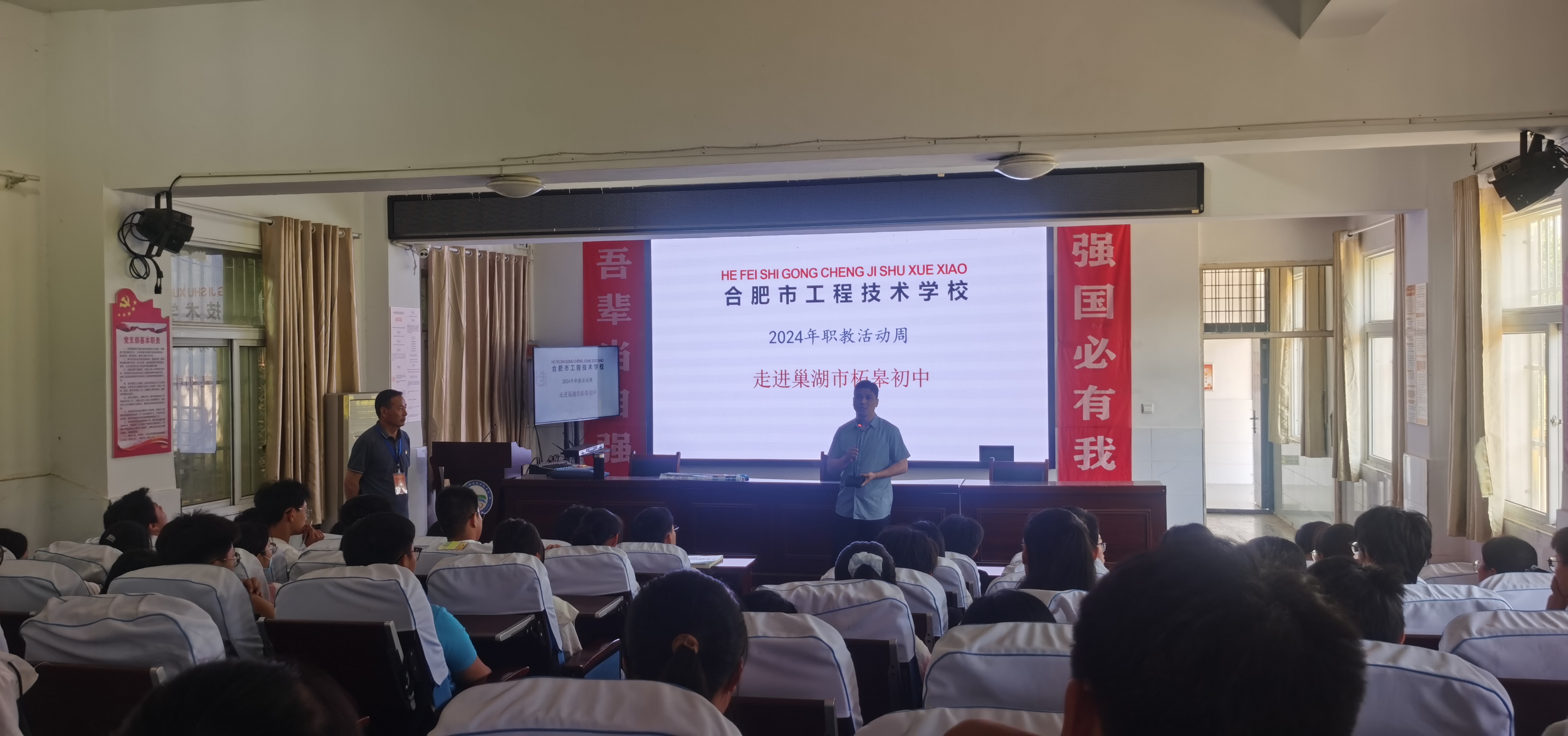 为贯彻落实习近平总书记对职业教育工作的重要指示,大力弘扬劳动光荣、技能宝贵、创造伟大的时代风尚,进一步营造全社会关心支持职业教育的良好氛围,提高初中学生对职业教育的了解,增强职业教育的吸引力,5月23日上午,校长潘明、招生就业处副主任朱晓乐、旅游教研室主任张娟和合肥市中职学生技能大赛获奖选手韩丽彤同学一行走进巢湖市柘皋初级中学,开展2024年职业教育宣讲活动。