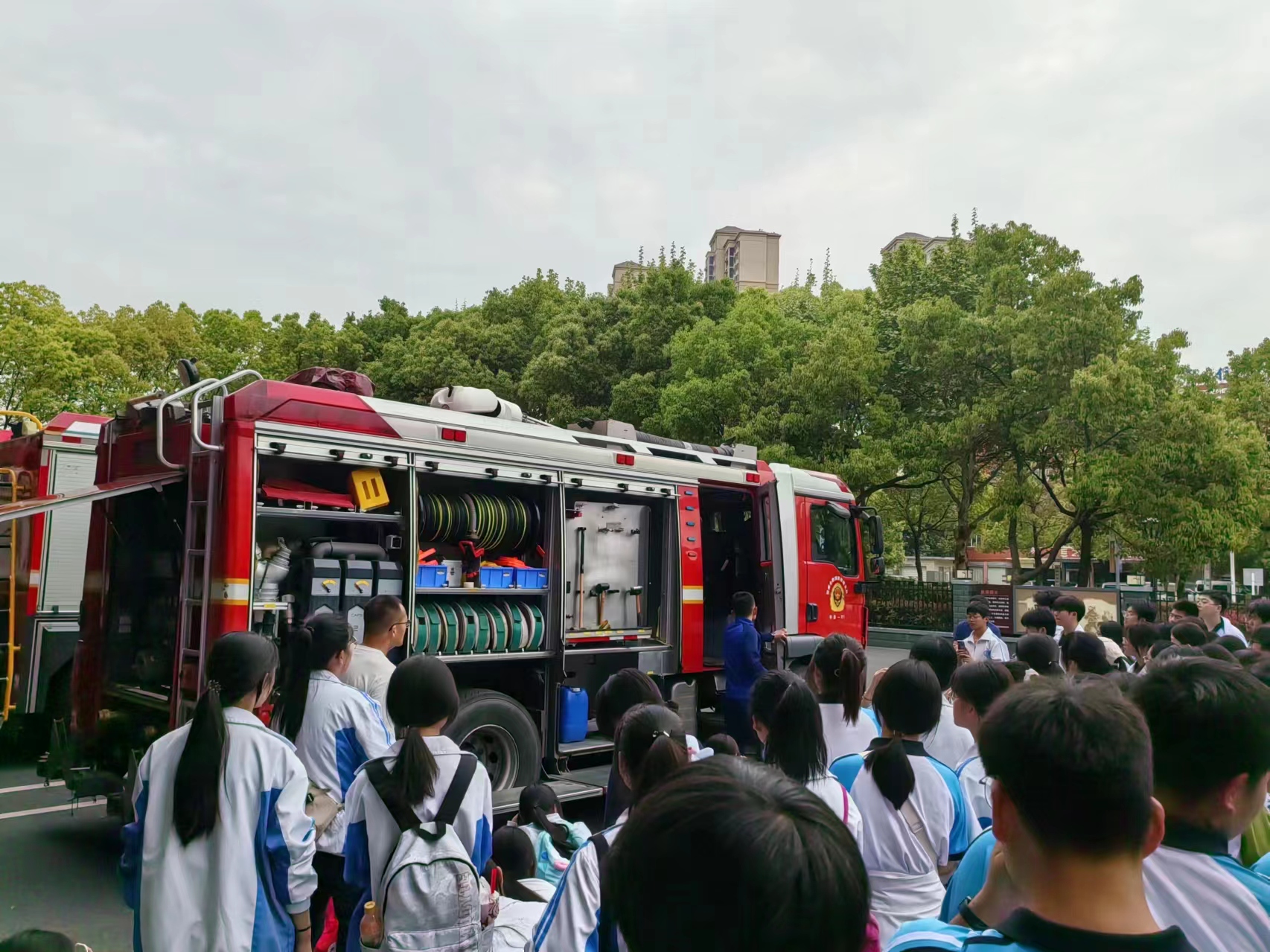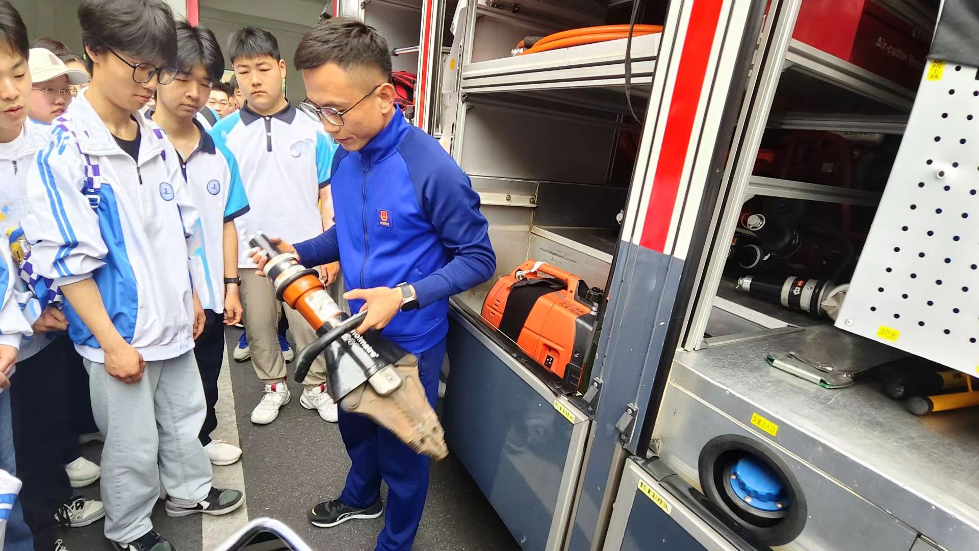 随后,学生们来到了消防救援车辆区。消防员们逐一介绍了各种消防车的功能特点。其中,水罐消防车、泡沫消防车和干粉消防车分别针对不同的火灾类型进行灭火作业;举高类消防车和云梯登高消防车则用于高空救援;远程供水消防车则能在水源较远的地方为灭火提供充足的水源。消防员们还向学生们展示了消防车上的各种救援工具,如钢梯、水枪、钢瓶、便携式灭火器等,让学生们对消防救援车辆有了更直观的认识。