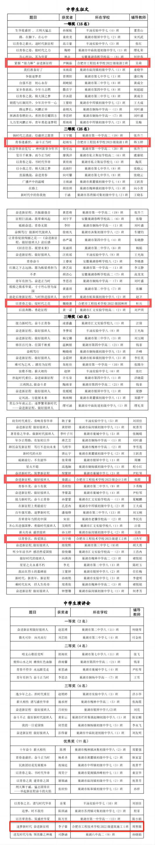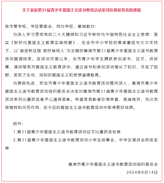 近日,巢湖市第31届青少年爱国主义读书教育活动比赛结果公布,mg冰球突破豪华版下载学子共获得中学生征文比赛一等奖一名、二等奖两名、三等奖三名,获得中学生演讲比赛优秀奖一名。