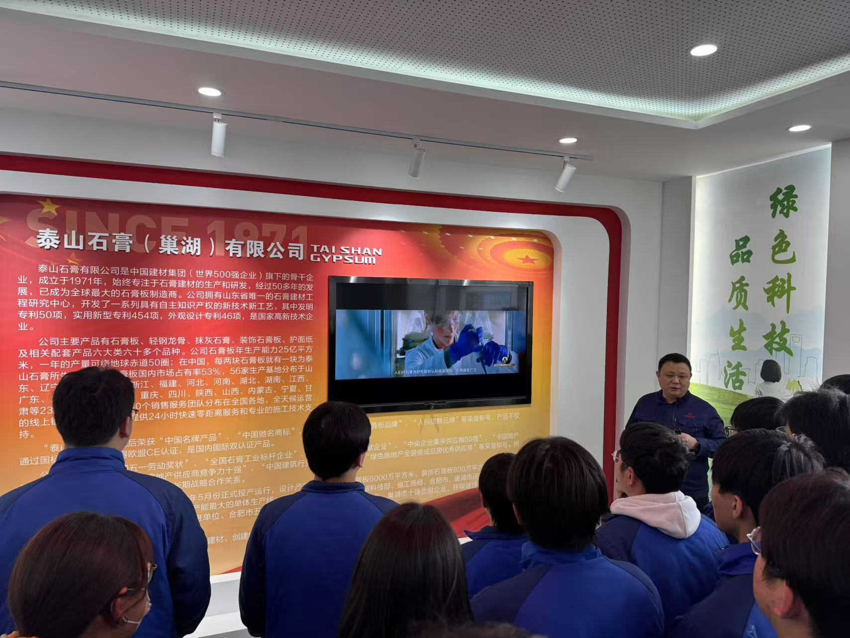 师生们首先来到泰山石膏(巢湖)有限公司,泰山石膏有限公司是世界500强中国建材集团旗下的骨干企业专注于石膏建材的生产与研发,属于国家高新技术企业。在公司的展览馆中,大家通过观看宣传视频了解了企业的基本概况,并参观了公司主营产品的展示区和生产车间。公司综合处处长徐亮详细向大家介绍产品的特点和用途,石膏建材产品先进的新工艺技术和良好的市场效应,引得同学们啧啧称赞。参观完毕,同学们纷纷表示,作为新时代的中职学生,一定要紧跟时代步伐,努力学习新知识、掌握新技能,勇于创新,敢于突破,为推动经济社会发展注入新的动力。