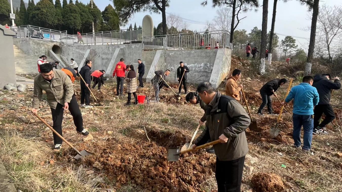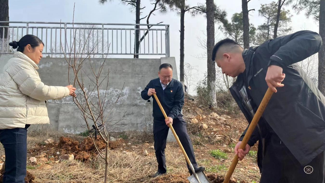一桶清水,灌溉希望,一棵树苗,承载未来。植树现场,党旗飘扬,党员同志们热情高涨、干劲十足,大家发扬不怕苦、不怕脏、不怕累的精神,分工协作、挥锹铲土、扶树填坑、踏土夯苗、提水浇灌,有条不紊地完成植树各个环节。经过共同努力,一株株新栽种的桃树苗迎风挺立,为大地增添了勃勃生机。