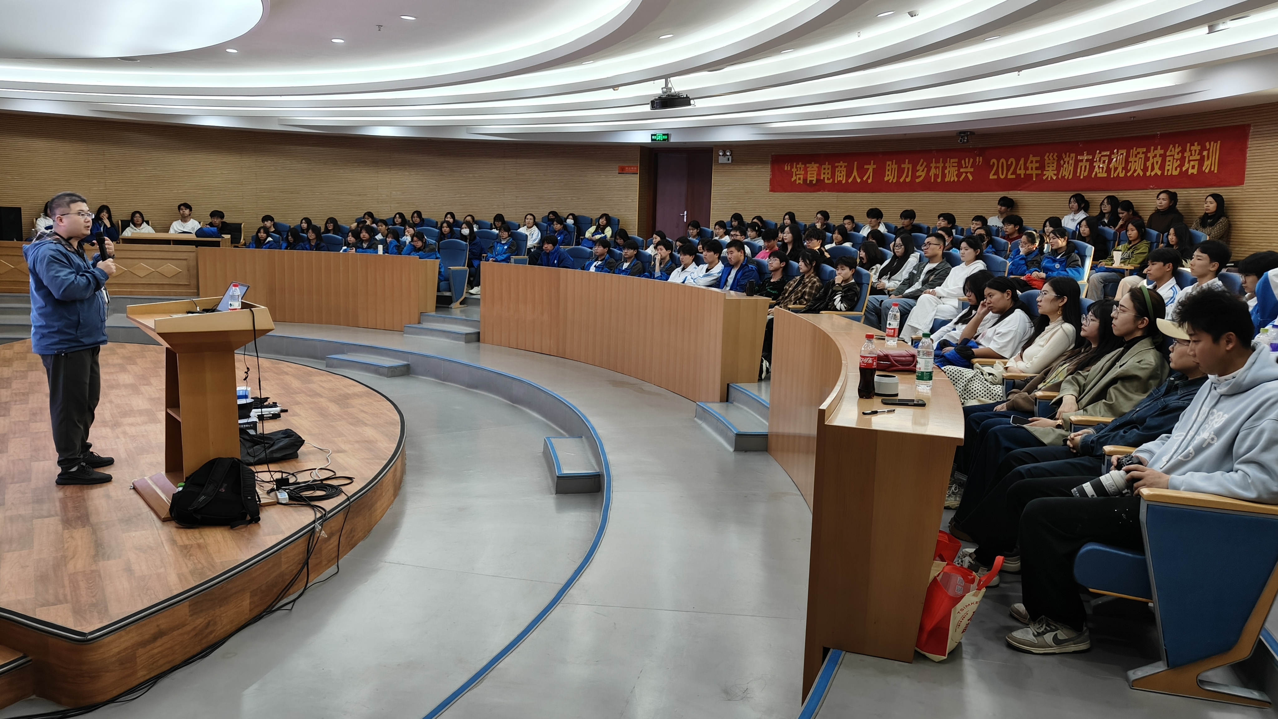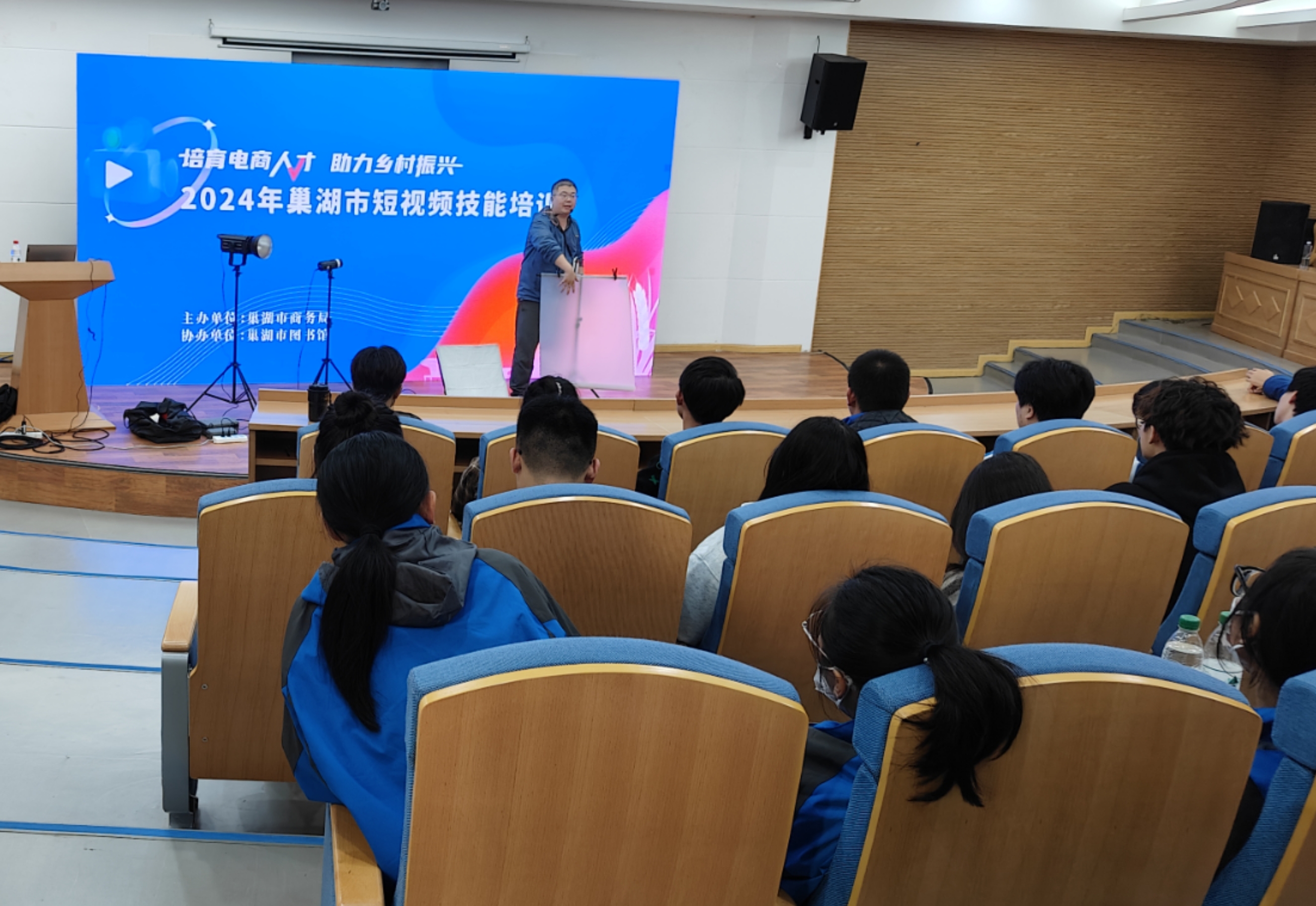 为进一步提升mg冰球突破豪华版电子商务专业学生的专业素质和能力水平,增强专业自信和职业规划意识,更好适应即将到来的实习和就业,满足社会发展和乡村振兴对电商人才的需求,11月10日下午,学校组织2022级和2023级近百名电子商务专业学生赴巢湖市图书馆,聆听由巢湖市商务局主办,以“培育电商人才 助力乡村振兴”为主题的短视频技能培训讲座,相关班主任和部分电商专业教师参加了讲座活动。