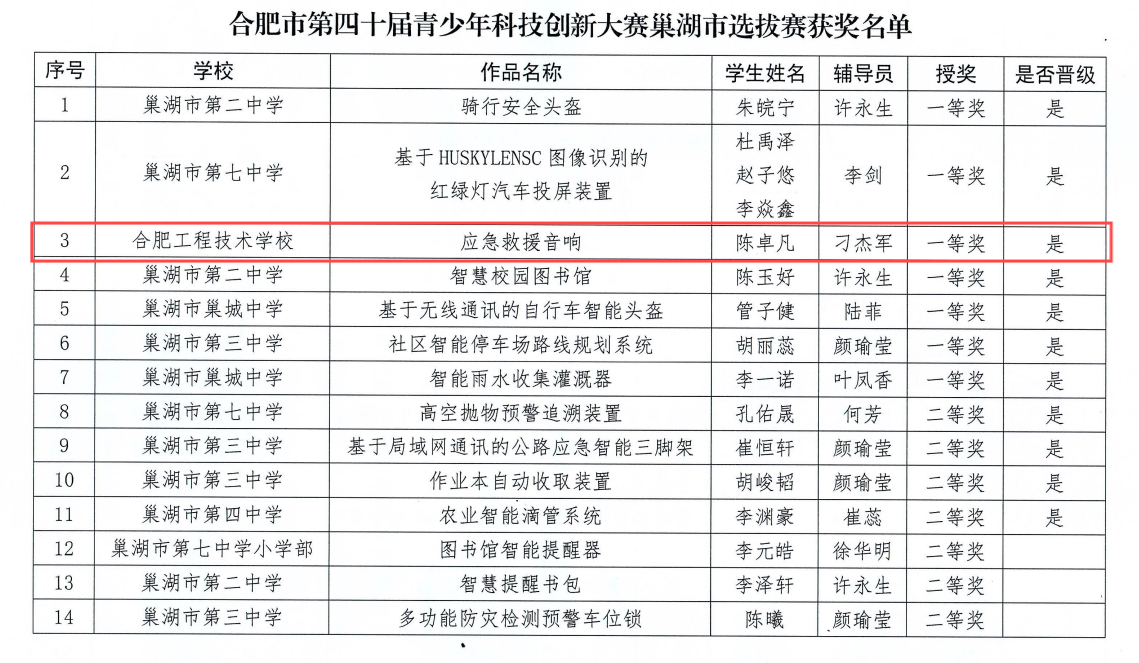 近日,合肥市第四十届青少年科技创新大赛巢湖市选拔赛成绩公布。mg冰球突破豪华版下载陈卓凡同学荣获青少年科技创新成果项目一等奖。