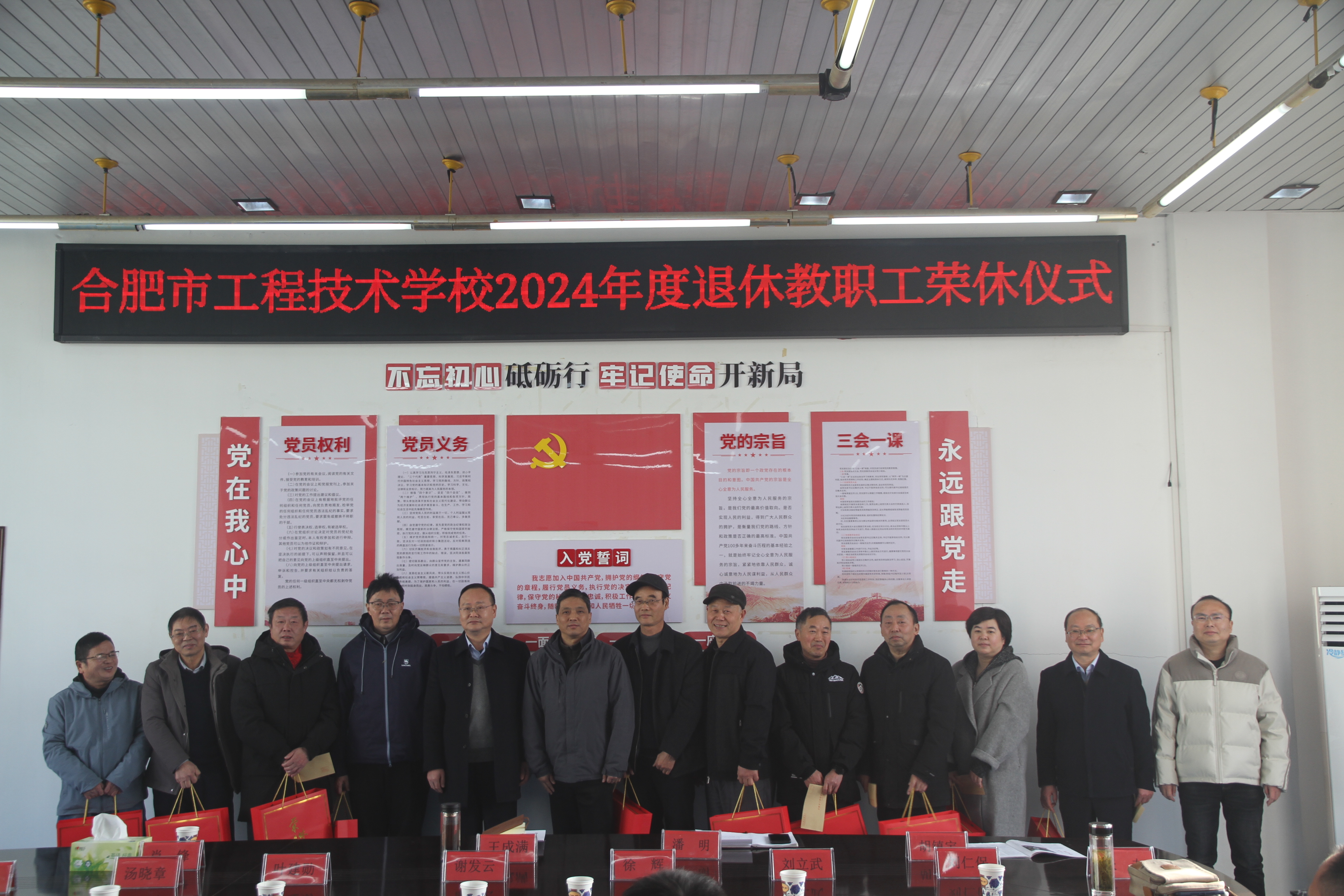 随后,校领导为退休教职工送上了纪念牌和纪念品,并集体合影留念。