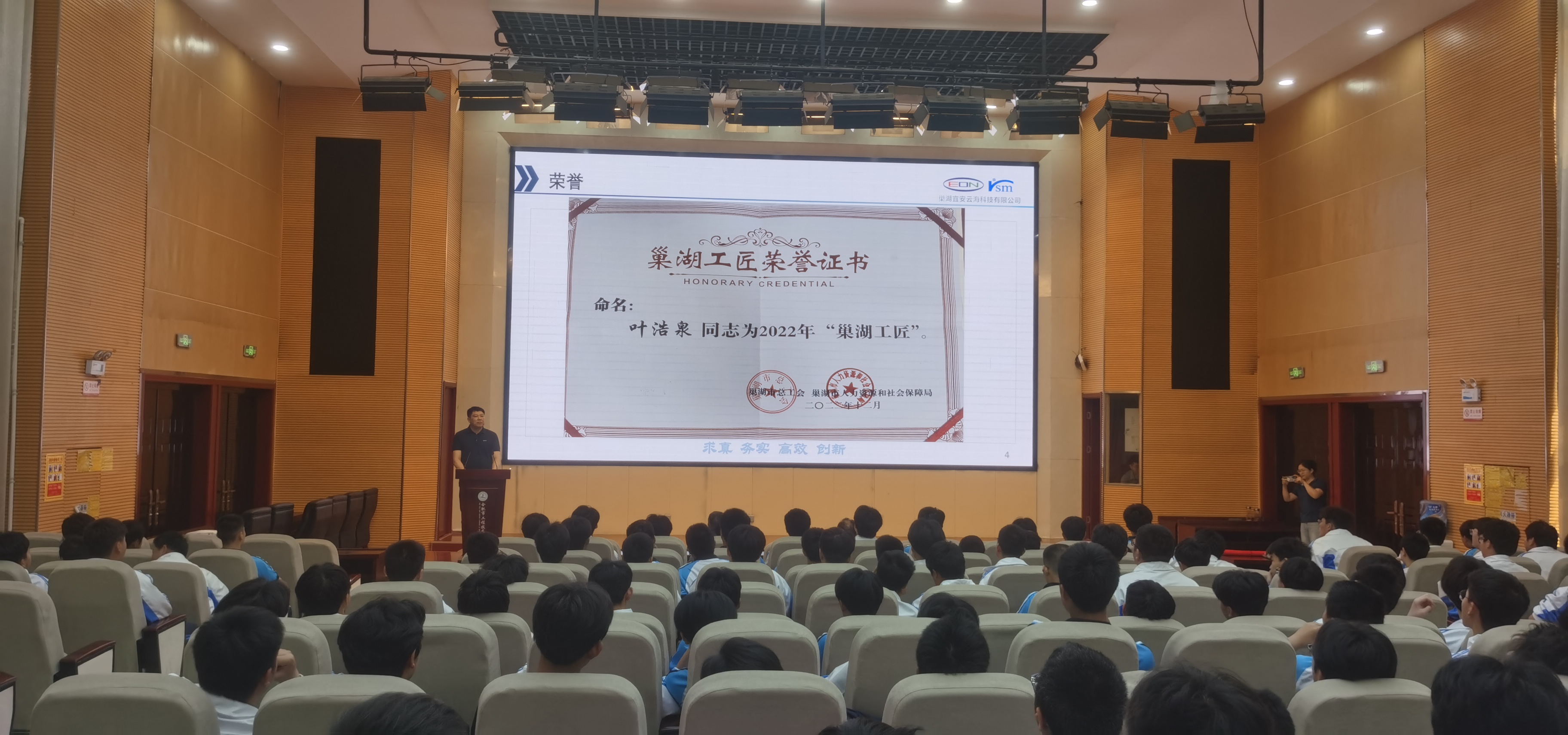 宣讲活动中,叶浩泉以自己的工作经历,展现了一名从普通机修学徒到上市公司设备管理部主任的蜕变之路。 他深情地说,“机械维修工,这份在别⼈眼中是异常辛苦的工种,但因为自己的热爱,却能够在平凡的工作中感到津津有味,乐在其中”。正是凭着对事业的热爱和执着,叶浩泉在2022年、2024年分别被授予 “巢湖工匠”和“巢湖市金牌职工”荣誉称号。