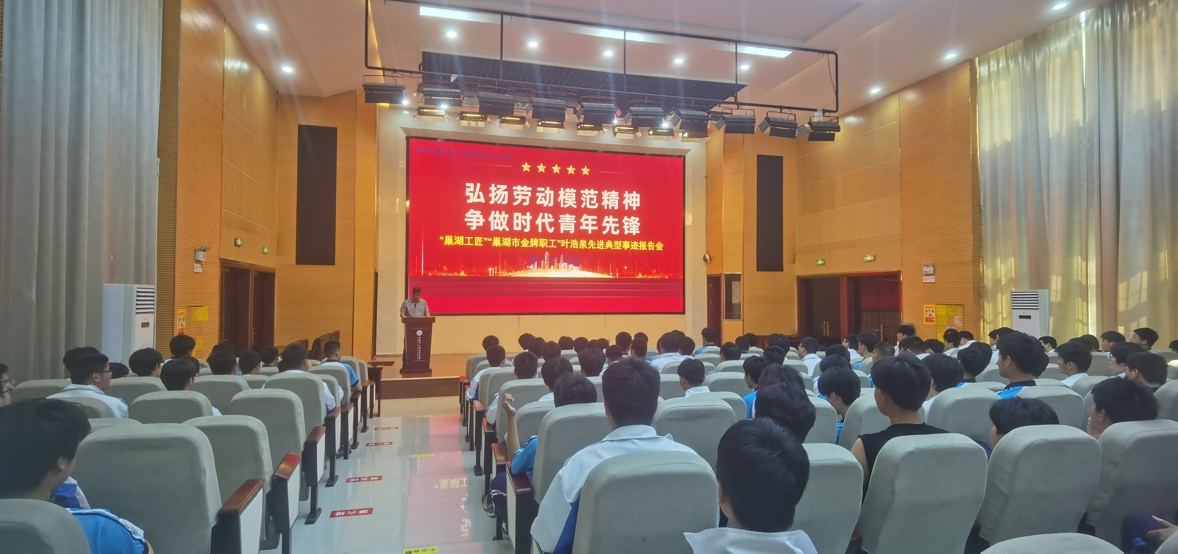 为深入学习宣传贯彻习近平新时代中国特色社会主义思想和党的二十大精神,践行社会主义核心价值观,进一步弘扬劳模精神、劳动精神、工匠精神,厚植劳动情怀,营造劳动最光荣的校园文化氛围,培养德智体美劳全面发展的社会主义建设者和接班人,5月22日上午,mg冰球突破豪华版在报告厅隆重举行“劳模工匠进校园”宣讲活动。巢湖宜安云海办公室主任朱善祥、设备管理部主任叶浩泉、办公室副主任刘桂梅和2023级机械、汽修专业全体学生参加本次宣讲活动,活动由校长潘明主持。